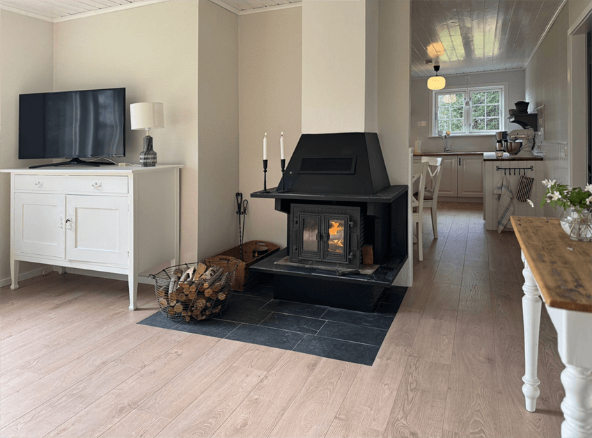 Inside the house, a fireplace also creates a cosy atmosphere – ideal for quiet evenings after a day by the lake or in the forest.
