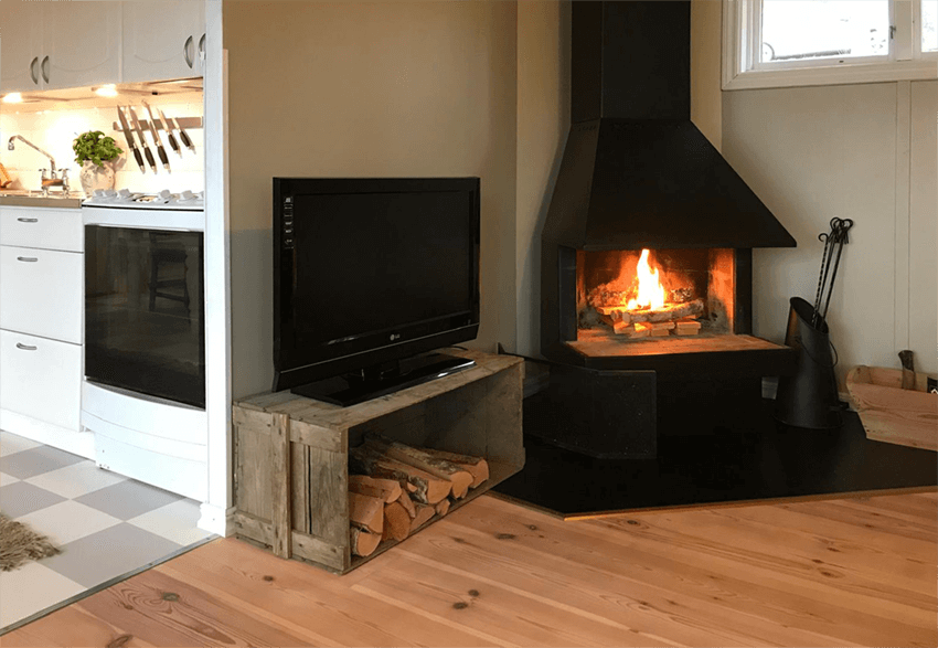 The living room features a fireplace for a cosy atmosphere. A certain amount of firewood is provided free of charge; if more is needed, additional wood can be purchased on site.